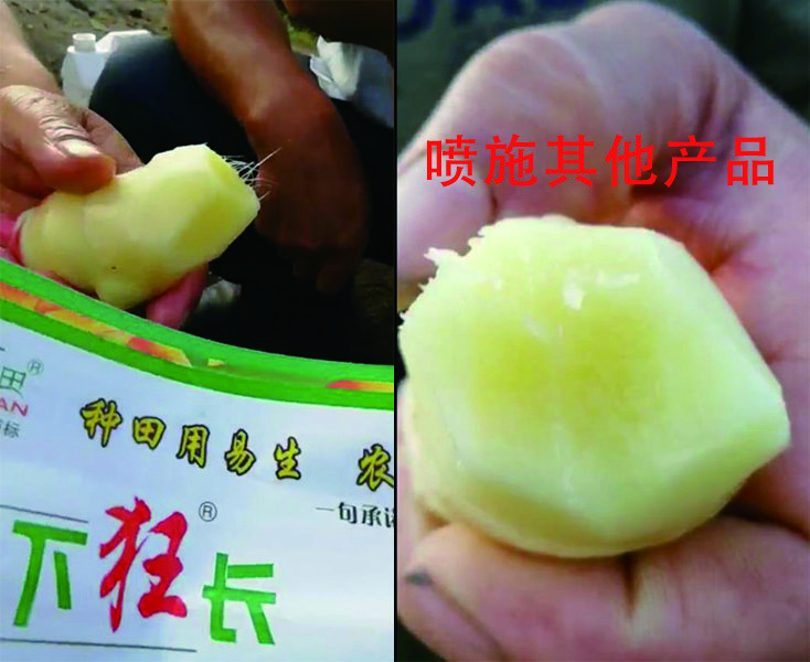 看這對比圖就知道,地下狂長(cháng)效果有多好。現場(chǎng)直接拔出大姜,沖洗,切姜。為了公平起見(jiàn),我們工作人員對比了姜的側芽,明顯看出,噴施過(guò)地下狂長(cháng)的大姜干物質(zhì)多,不僅姜絲長(cháng),粗,多,而且顏色也金黃光亮